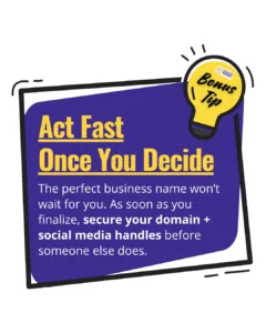 Tasks: Brainstorm names → test for spelling, pronunciation, memorability → future-proof (avoid too niche).